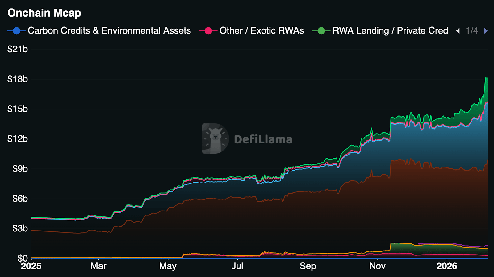 Já o DeFiLlama reporta $17,3 bilhões como total de RWAs disponíveis onchain.