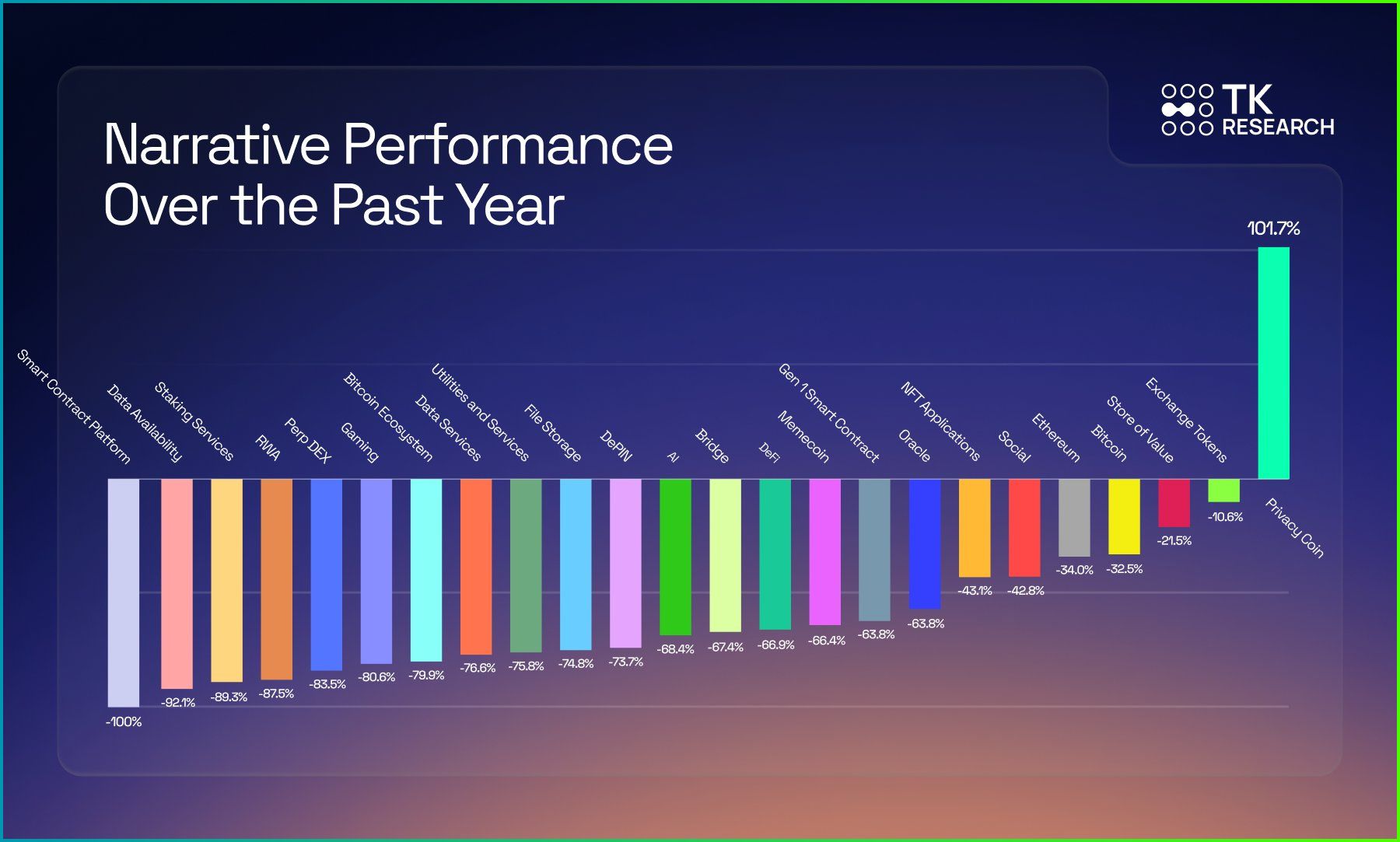 A performance das narrativas cripto no último ano mostrou uma dispersão extrema entre vencedores e perdedores.