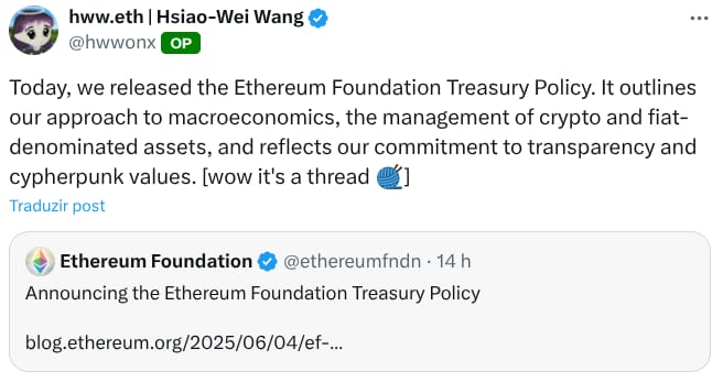 “Hoje, divulgamos a Política de Tesouraria da Fundação Ethereum. Ela descreve nossa abordagem à macroeconomia, à gestão de ativos denominados em criptomoedas e moedas fiduciárias e reflete nosso compromisso com a transparência e os valores cypherpunk. [uau, é um fio 🧶 ]”.