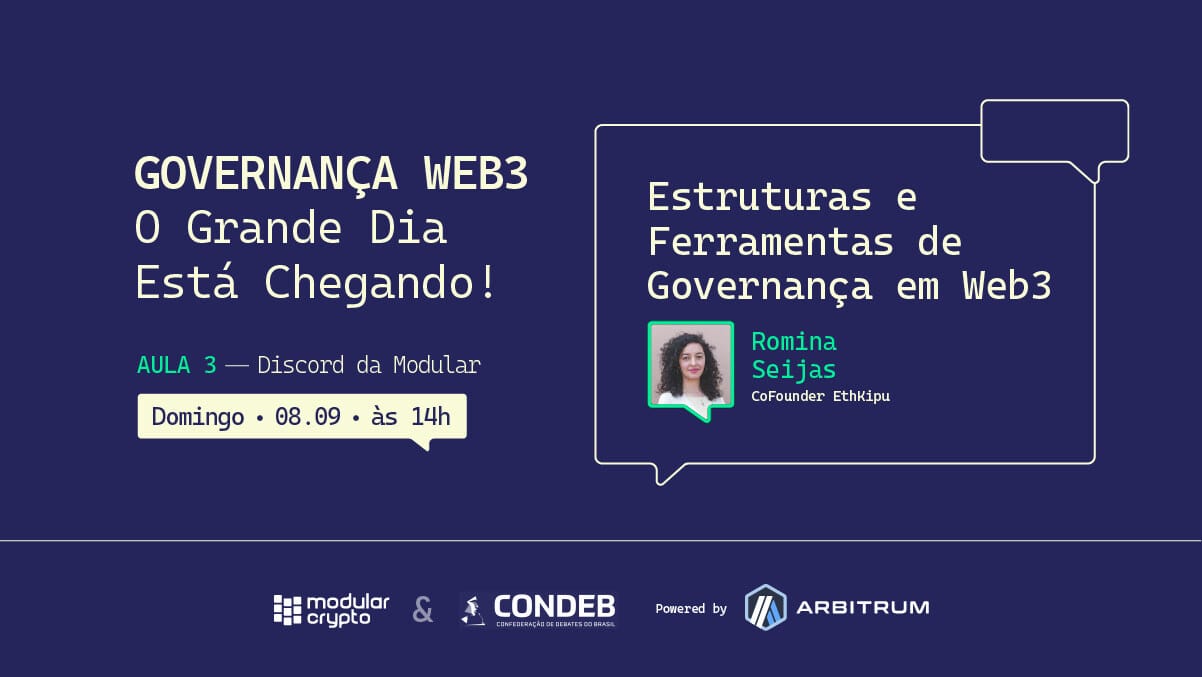 Neste domingo, às 14h, receberemos Romina Seijas, Cofounder da ETHKipu, para uma aula imperdível sobre estruturas e ferramentas de governança em Web3! Romina vai ensinar sobre DAOs, plataformas de votação e tokens de governança — tudo que você precisa saber para se destacar na governança descentralizada.