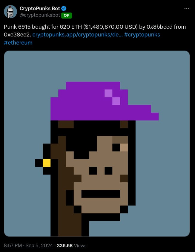Em meio a uma crise no mercado de NFTs, o CryptoPunk 6915, um dos raros Ape Punks, foi vendido por 620 ETH (cerca de US$ 1,48 milhão). O colecionador anônimo fez a compra em um momento em que o mercado de NFTs enfrenta desafios de liquidez.