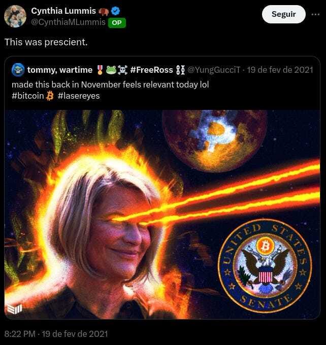 Além disso, os Laser Eyes representam a identidade e a força da comunidade Bitcoinheira, diferenciando-a de outras subculturas cripto.