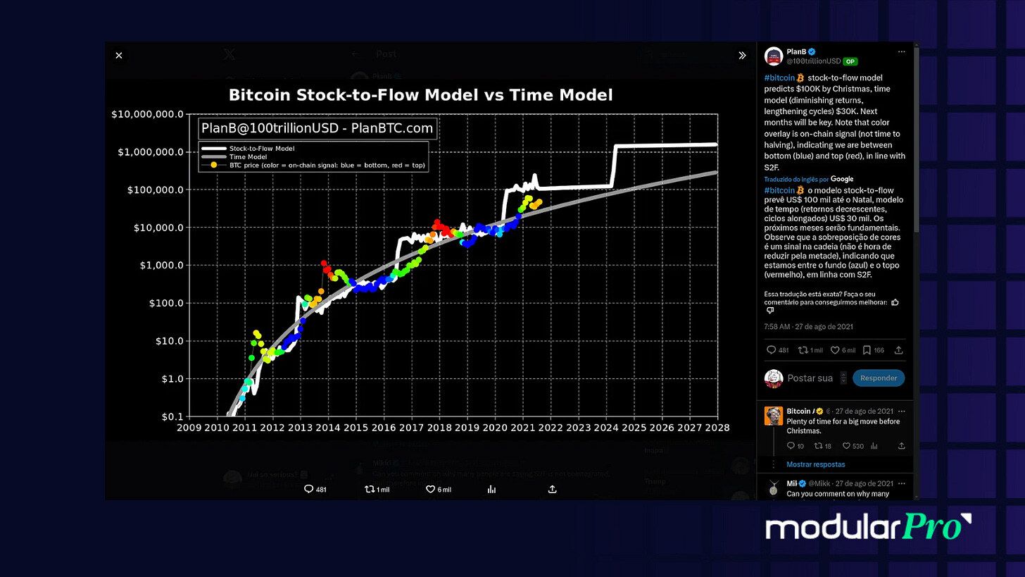 Na mesma época em que o meme dos Laser Eyes ganhava tração, um analista conhecido como PlanB, e seu modelo matemático chamado Stock-to-Flow (S2F), estavam em evidência. Esse modelo estimava os topos e fundos do mercado de Bitcoin com base na sua escassez. De acordo com o S2F, o topo do ciclo de 2021 do Bitcoin seria de 100 mil dólares. Isso alimentou ainda mais o entusiasmo e a esperança por trás do #LaserRayUntil100K.