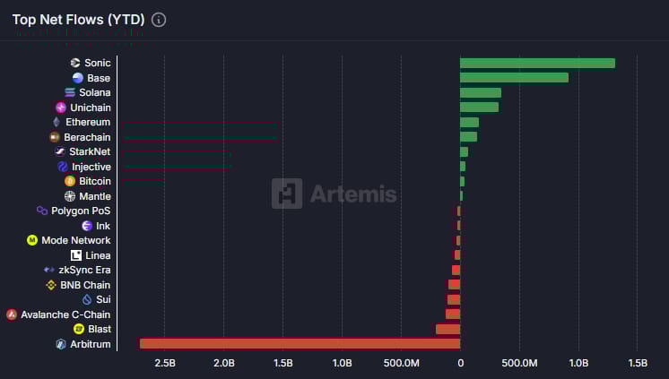 Logicamente, isso tem relação direta com o fato da Arbitrum ser a rede que mais perdeu capital em 2025 naquela lista. Foram US$ 2,7 bilhões negativos em fluxo líquido, de acordo com a Artemis.