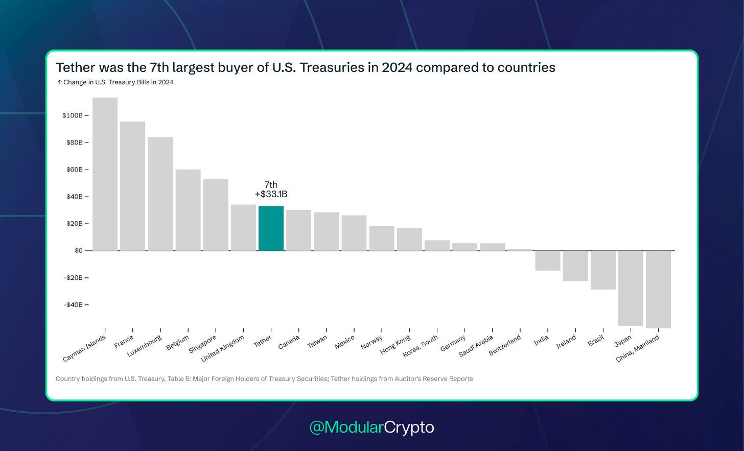 Gráfico do Dia: Tether supera a Alemanha em participações em títulos do Tesouro US.