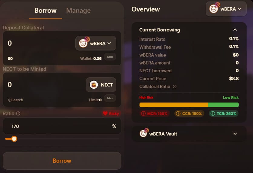 A estratégia do Beraborrow começa depositando WBERA e para pegar NECT, a stablecoin do protocolo.