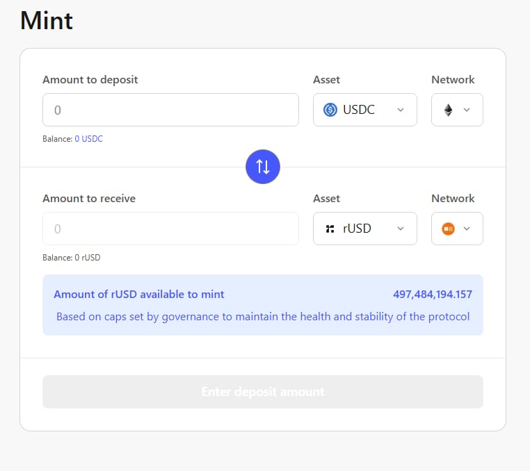 Uma forma de mover fundos para a Berachain é emitir tokens rUSD diretamente na rede. Para isso, basta usar a Reservoir e trocar USDC da rede Ethereum para rUSD na Berachain.