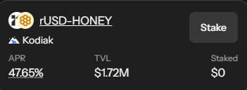 Existe ainda um passo bônus com Infrared, que oferece um vault rUSD-HONEY na Kodiak, com retorno de 47,65% em iBGT no momento da escrita deste guia.