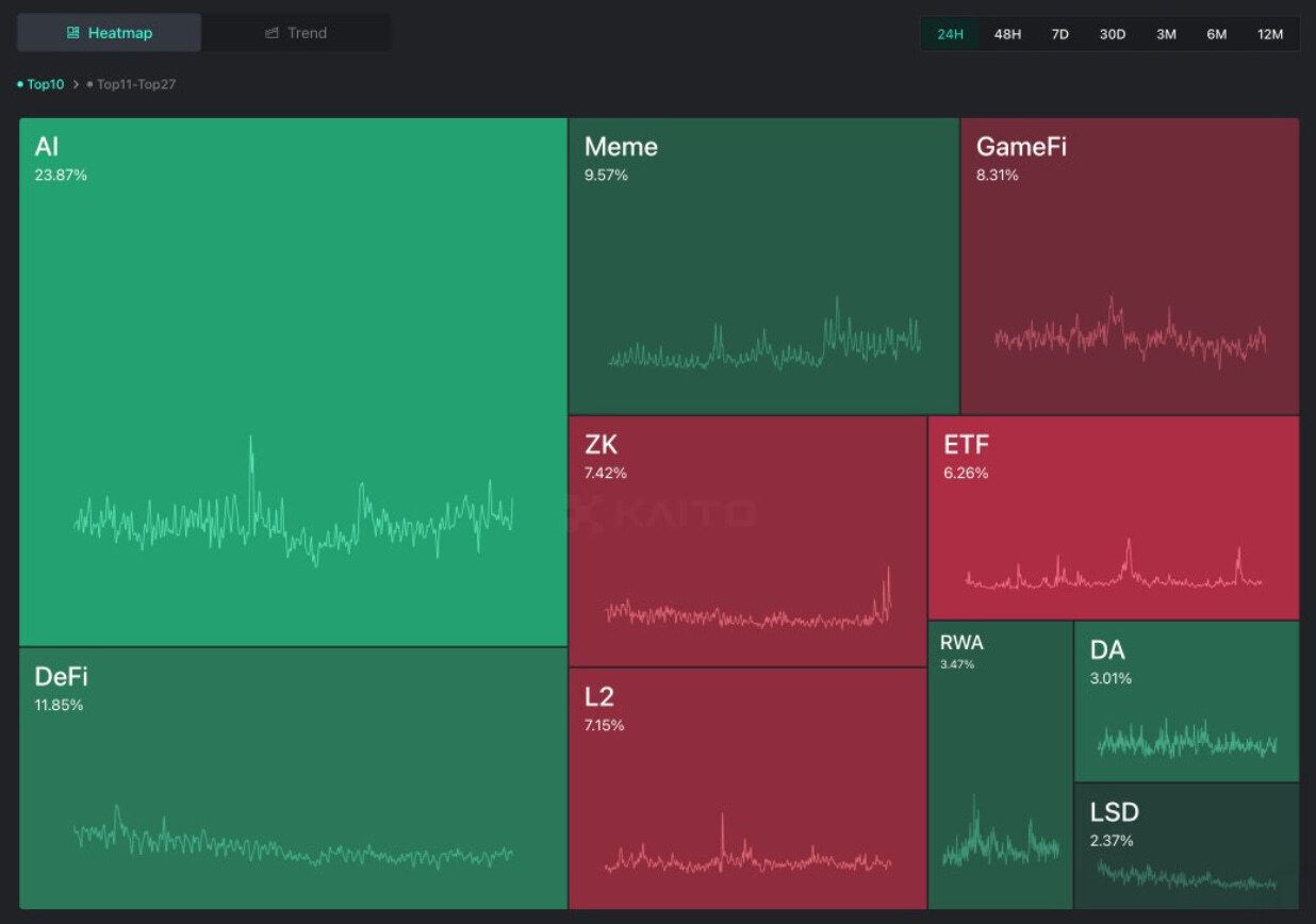 E aí veio a Kaito AI, outro serviço voltado à disponibilização de dados on-chain, e apontou que os papos sobre tokens de DeFi superaram as memecoins na comunidade de cripto do X. Basicamente, o que o cabeça da CryptoQuant tinha dito um dia antes acabou sendo reforçado: a galera parece estar se interessando mais por DeFi do que por memecoins.