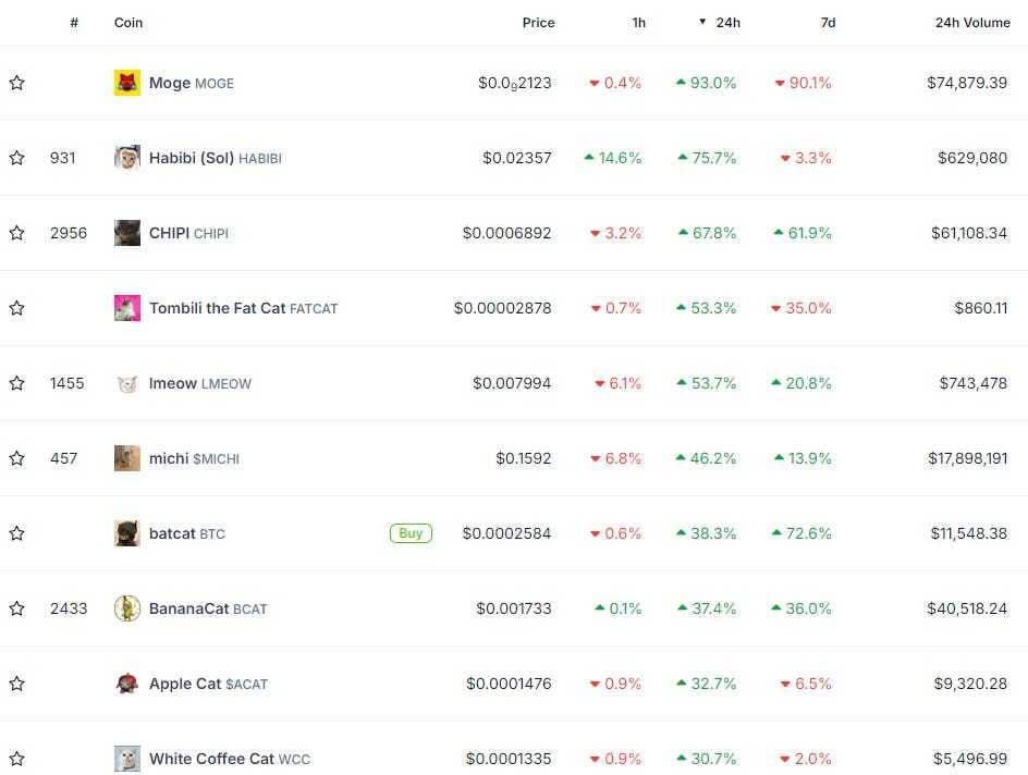 Não é um volume baixo, longe disso! Mas é a categoria de memecoins no geral, já somando tudo. Volta na imagem ali e olha quanto movimentaram os tokens de gatinho, que foram os que mais valorizaram nas últimas 24 horas enquanto escrevo o texto.