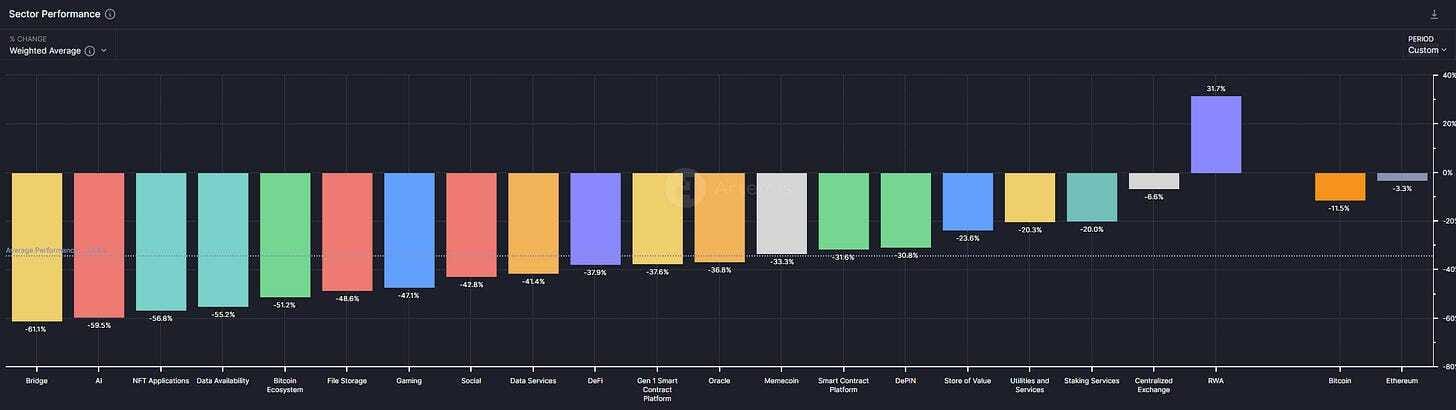 Enfim, voltando. Os tokens de RWA subiram 31% no atual trimestre, ofuscando com força o restante dos outros setores, ainda nos dados da Artemis.