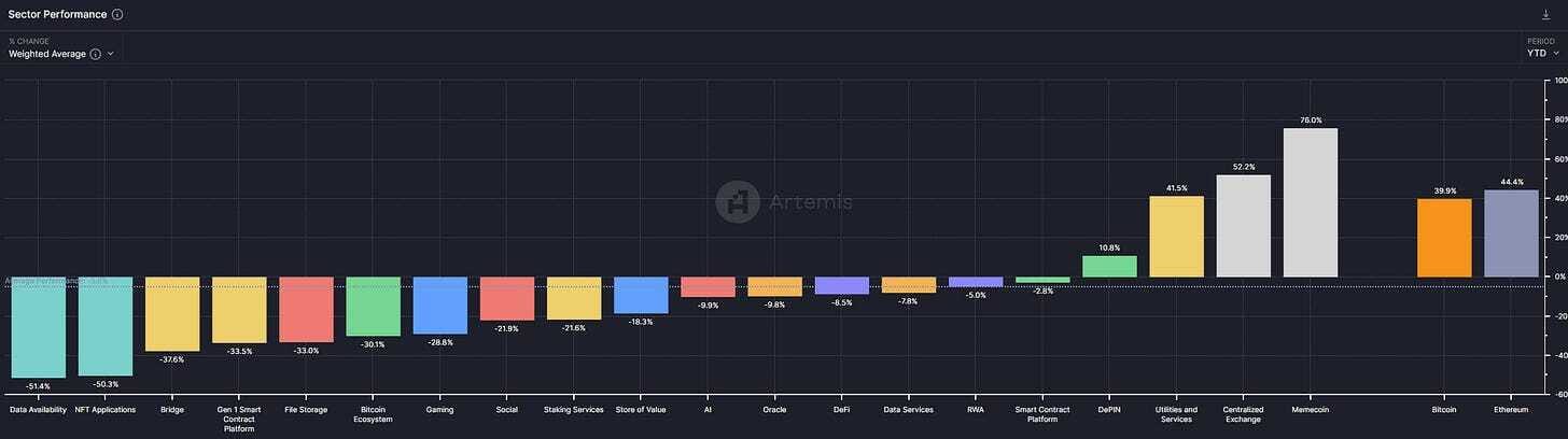 Antes de encerrar, gostaria de ressaltar que o setor de memecoins ainda é o que apresenta a maior valorização média até agora em 2024, com crescimento de 76%. Os dados são da Artemis.