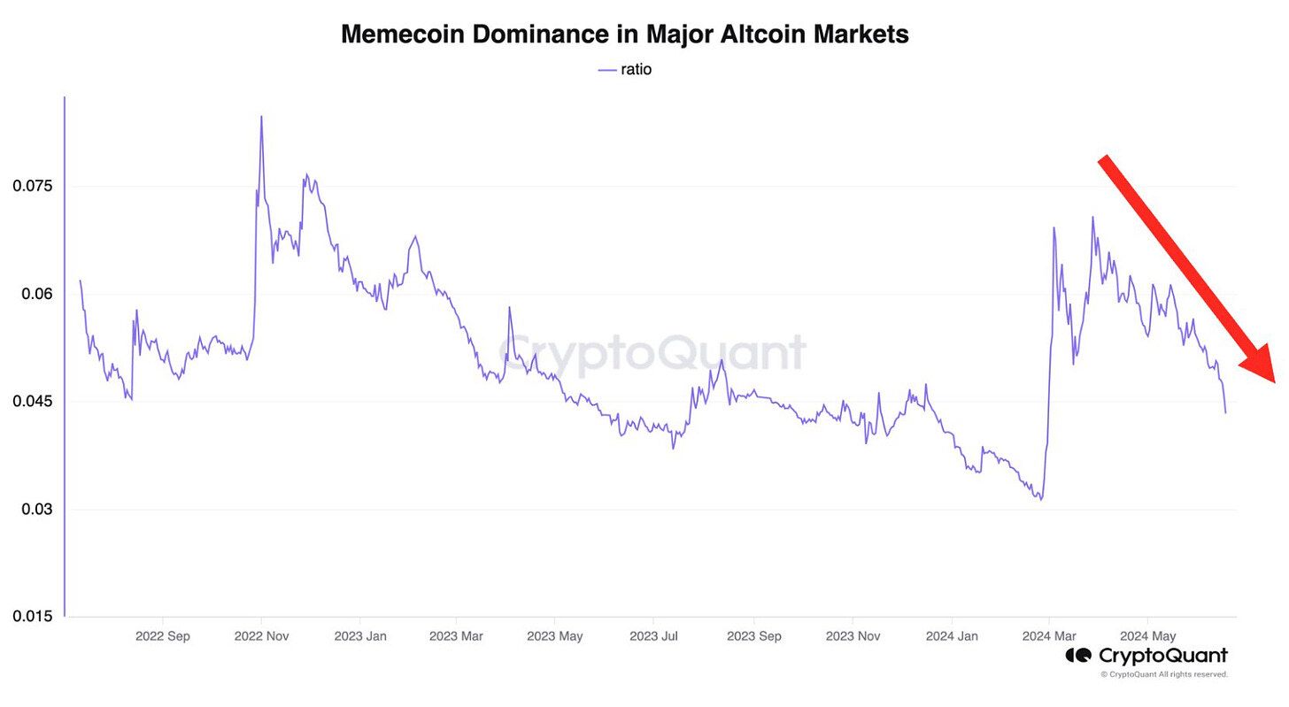 Ki Young Ju, que é o CEO da famosa plataforma de dados CryptoQuant, publicou no dia 19 de junho que a dominância das memecoins no mercado de altcoins está caindo rápido nas últimas semanas. A imagem que ele compartilhou foi essa, e calma que a gente já vai chegar lá.