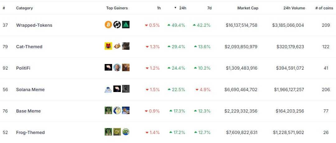 No dia 24 de junho, o mercado tomou uma sapecada e muitas criptomoedas caíram. Um dia depois, enquanto escrevo esse texto, quatro das cinco categorias que mais valorizaram nas últimas 24 horas são de memecoins. Se liga na imagem abaixo!