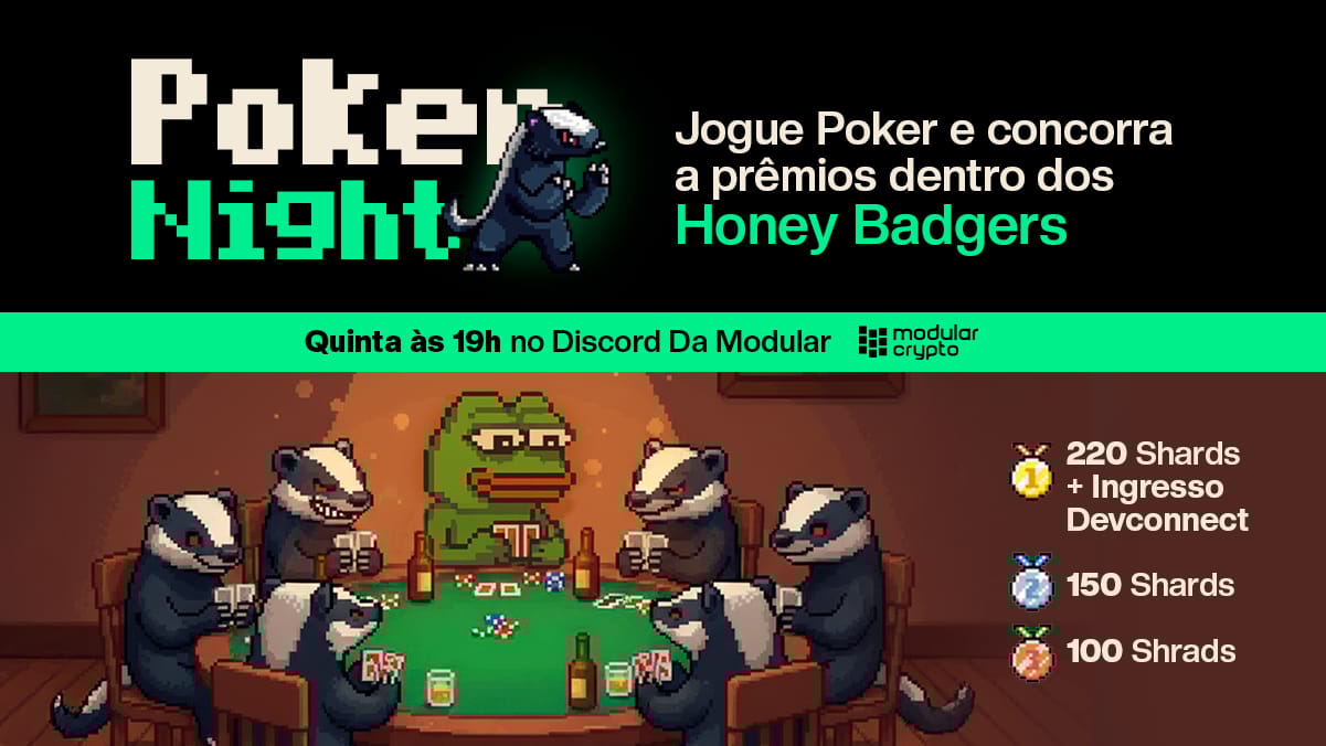 A Modular e os Honey Badgers abrem a mesa hoje, às 19h, pra uma Game Night de Poker valendo shards, prêmios e até ingresso pra Devconnect.