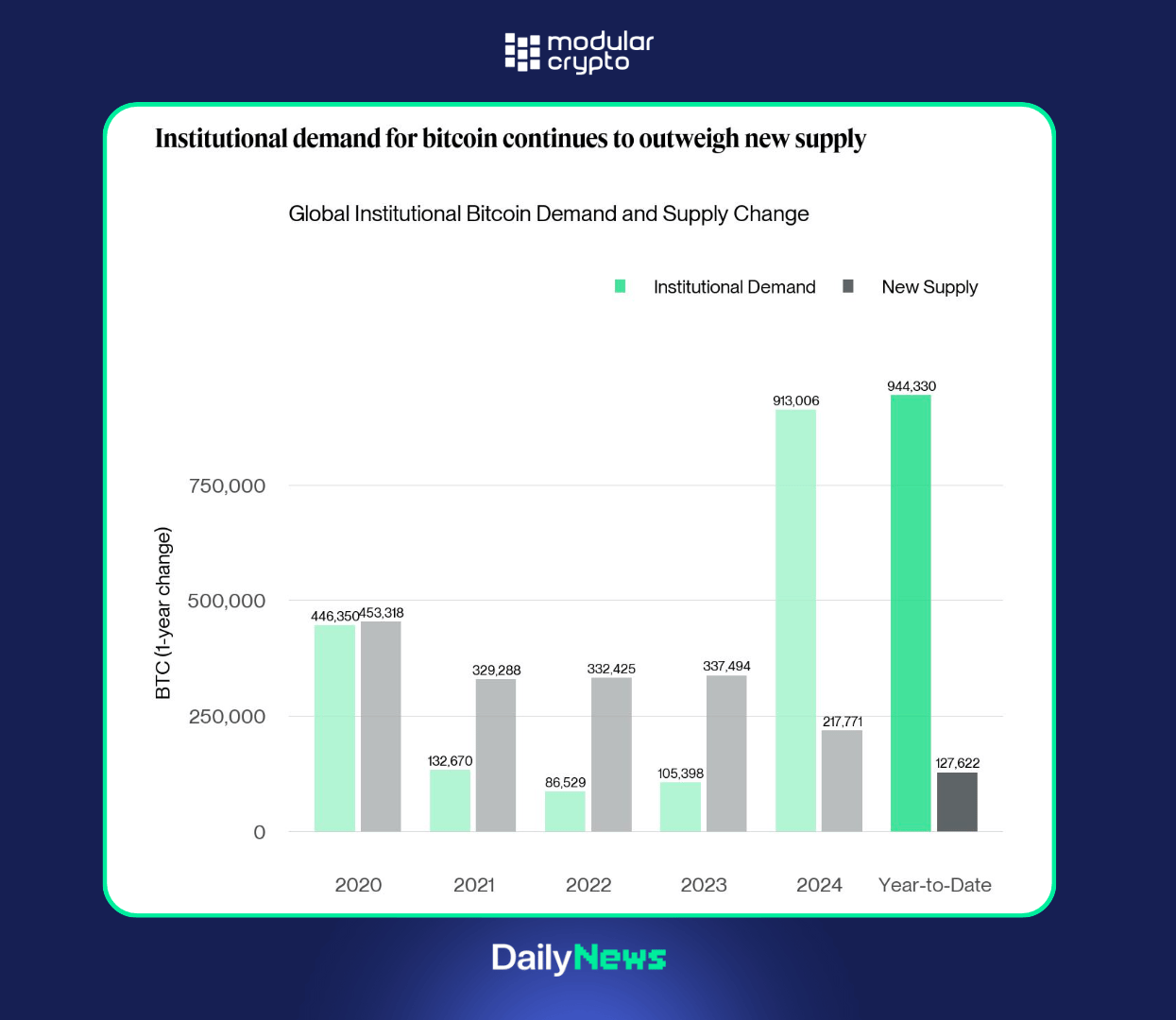 Segundo a Bitwise, fundos e empresas públicas já adquiriram 944 mil BTC em 2025 — superando o total comprado em 2024 e representando 7,4 vezes a nova oferta minerada no mesmo período.