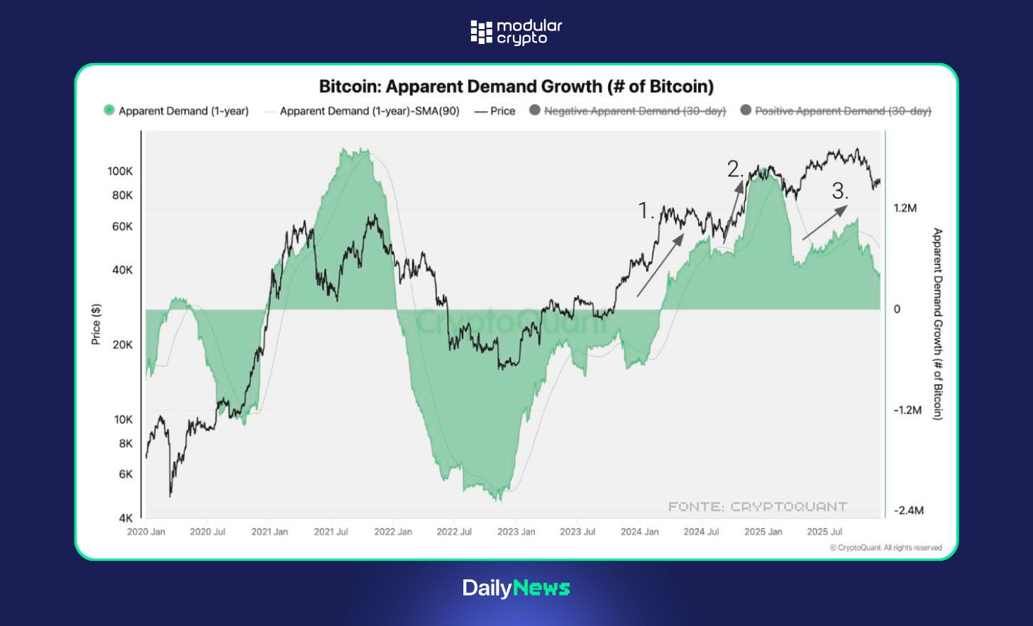 📊 Demanda por Bitcoin perde força — menos compradores novos, preço pressionado e cenário clássico de mercado à espera de um novo catalisador.