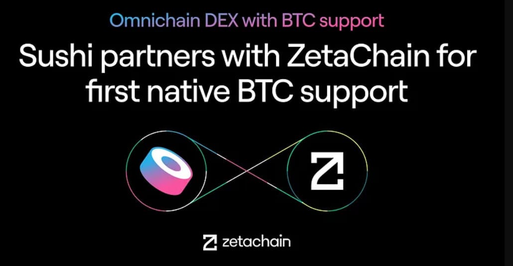 SushiSwap testa integração com ZetaChain para habilitar swap de BTC por qualquer outro ativo em uma única etapa, sem empacotamento ou bridge.