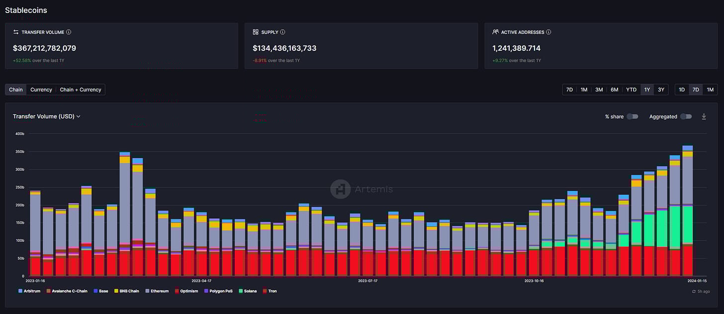 O volume de transferência de stablecoin ultrapassou US$ 367 bilhões na semana de 8 de janeiro.