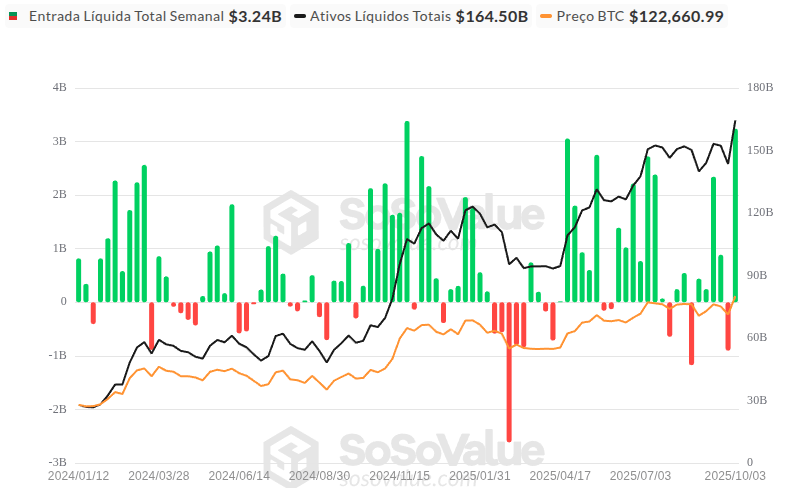 O Bitcoin rompeu um novo recorde ao atingir US$ 125,5 mil, impulsionado por entradas recordes em ETFs spot, retomada da demanda institucional e alta nos derivativos, segundo dados da Glassnode. Somente na última semana, os ETFs registraram mais de US$ 3,2 bilhões em entradas líquidas (SoSoValue), enquanto o volume diário de negociação superou US$ 26 bilhões, confirmando o retorno do apetite por risco no início do quarto trimestre.