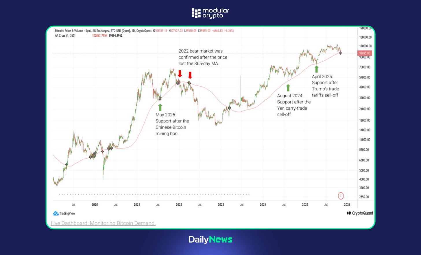 O Bitcoin perdeu a sua média móvel de 365 dias (US$ 102 mil), um dos principais suportes técnicos e psicológicos do ciclo. A última vez que isso aconteceu foi no início do bear market de 2022.