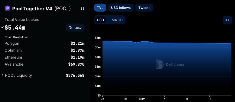 A versão anterior da PoolTogether, a V4, têm mais de $5 milhões de dólares depositados (TVL) em quatro blockchains: Ethereum, Polygon, Optimism e Avalanche.