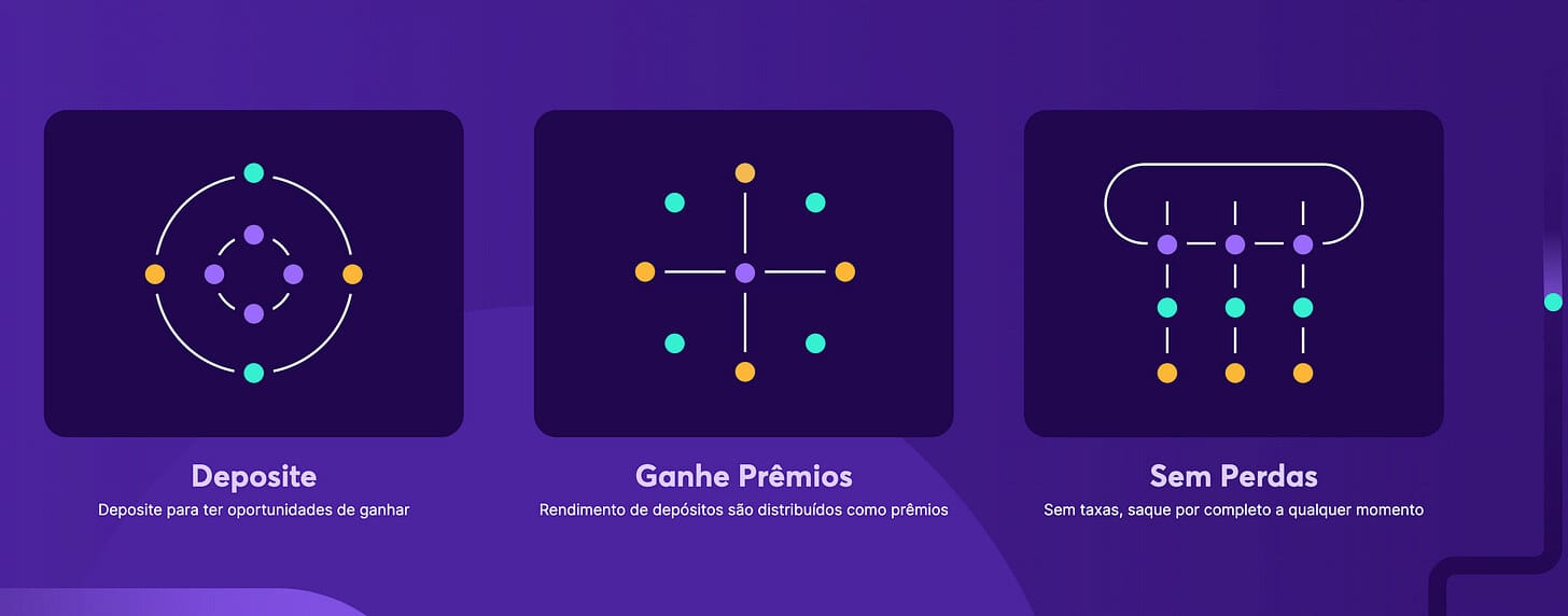 Ao contrário das estratégias degens extremamente criativas que vemos constantemente em crypto, a PoolTogether tem uma premissa bem simples: enquanto poupam dinheiro os usuários têm chances de ganhar prêmios, e ainda que um usuário não ganhe prêmios o capital estará protegido.