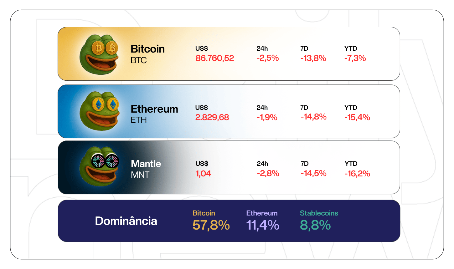 O gráfico reúne quatro dos modelos de preço on-chain mais importantes para identificar viradas de ciclo. Hoje, o Bitcoin está encostando no Active Investors Mean (≈ US$ 88,6 mil) — a faixa onde, historicamente, os investidores realmente ativos equilibram seu preço médio. Se o BTC perder essa linha e cair abaixo do True Market Mean (≈ US$ 82 mil), seria a primeira confirmação sólida de início de um bear market desde maio de 2022. Acima dessas métricas, o risco é mais moderado; abaixo delas, o mercado costuma entrar em fases prolongadas de fraqueza.