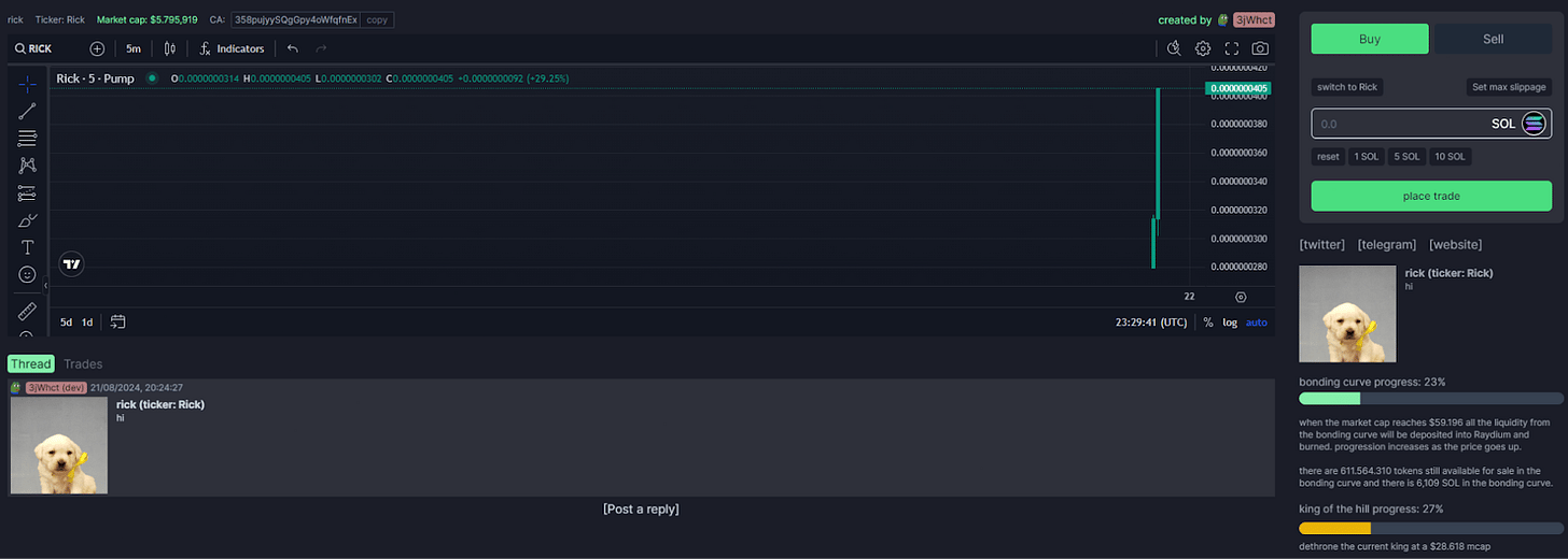 “Bonding curve?”, você me pergunta. Sim, bonding curve. Todo token no Pump.fun começa com o mesmo preço e, à medida em que o pessoal vai comprando, o preço vai subindo. Ao bater uma marca de valor de mercado, um pool de liquidez é criado automaticamente na exchange descentralizada Raydium e a brincadeira passa a rolar lá.