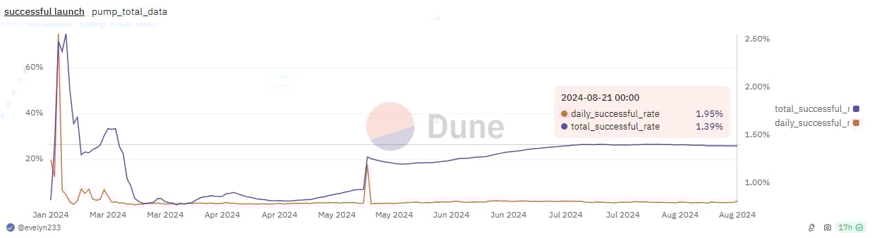 Até hoje, foram criados 1.849.832 tokens no Pump.fun, de acordo com o painel no Dune Analytics criado pelo usuário evelyn233. De todos eles, só 25.712 foram lançados na Raydium. Sim, isso dá menos de 2%.