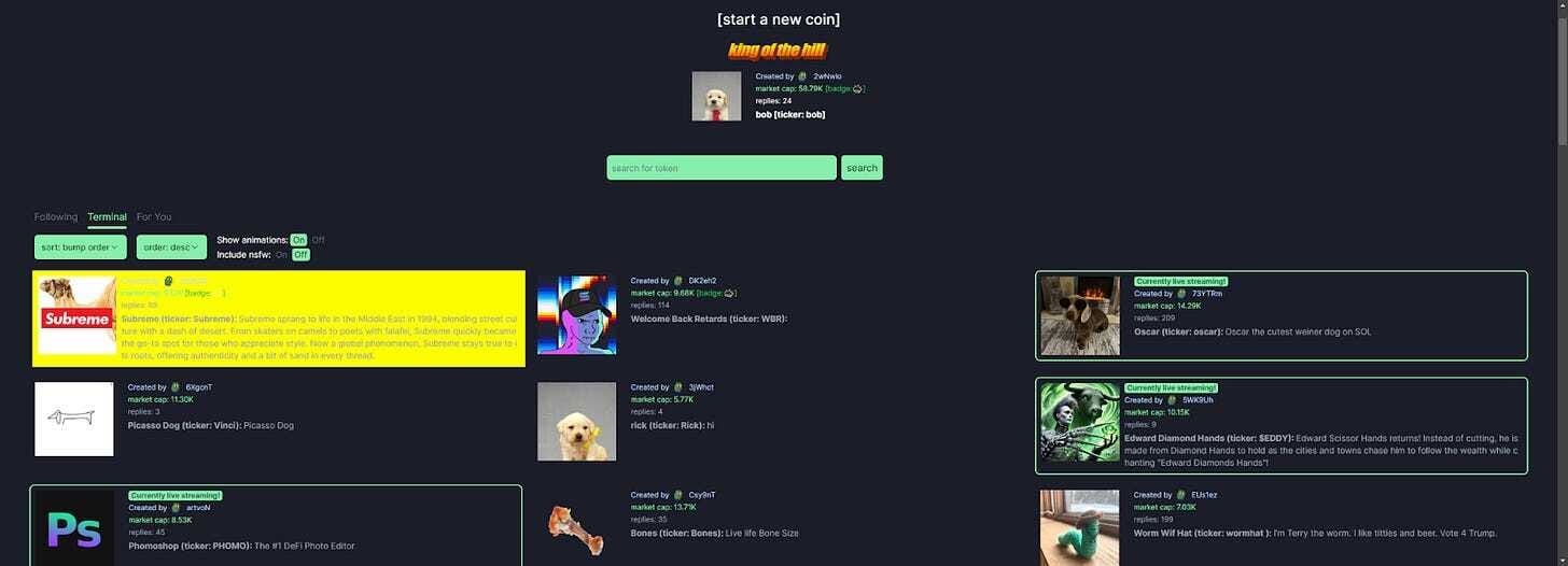 Abaixo, te dou um exemplo da tela inicial do Pump.fun. Depois que eu tirei o print, ela já mudou três vezes, de tanto token que é lançado nessa plataforma do tinhoso: