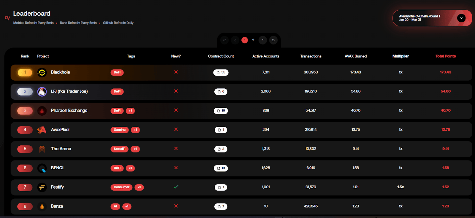 Mais uso = mais AVAX queimado = posição mais alta no ranking. Os Top 40 projetos no final da rodada ganham recompensas do pool de US$ 40 milhões.