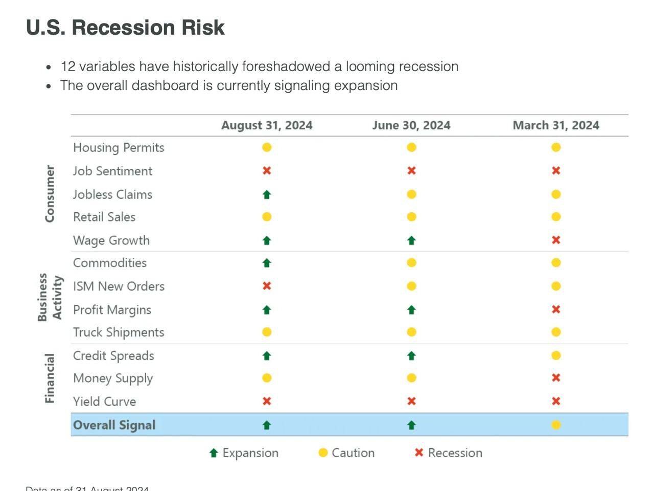 Olha, de acordo com a Franklin Templeton, que é uma das 20 maiores gestoras de ativos do mundo, os sinais são majoritariamente positivos. Isso significa que a possibilidade de uma recessão é baixa.