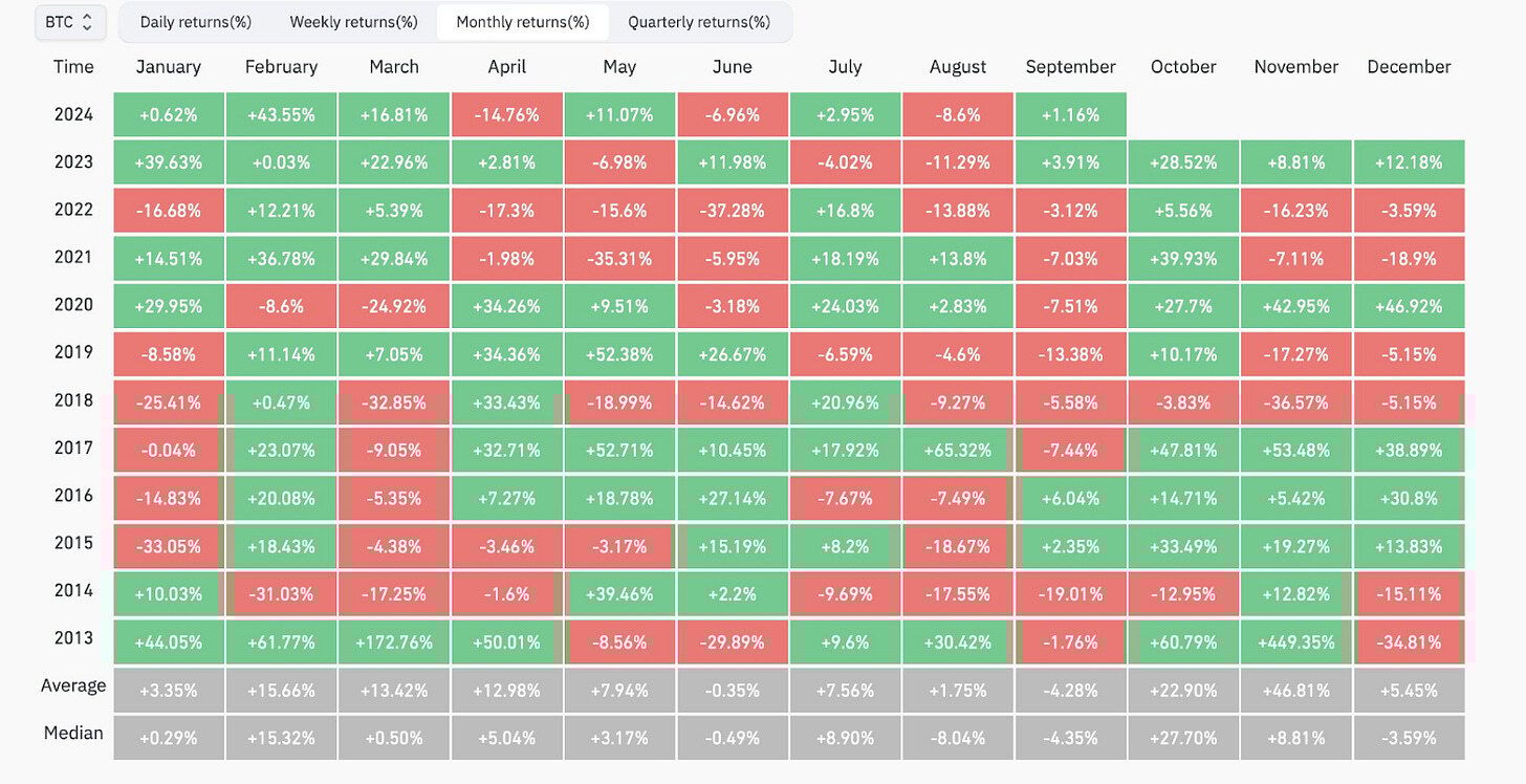 Essa performance ruim em setembro não rola só com o Bitcoin, mas com o mercado de ativos de risco no geral. É o período quando gestores estão voltando das férias e começam a mexer de novo no portfólio. Essas mudanças dão uma balançada o mercado.