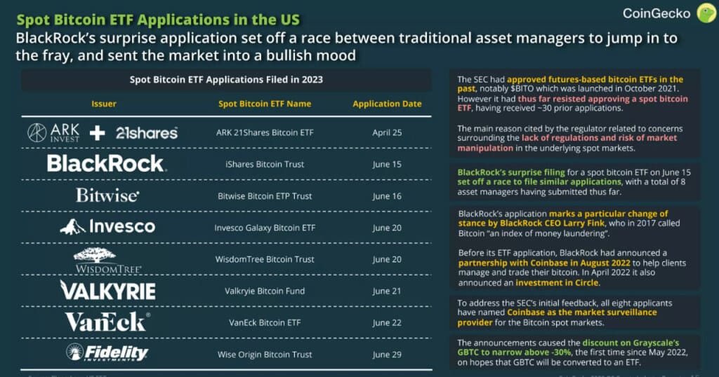 Contudo, foi apenas em junho que os ventos realmente mudaram para as criptomoedas, pois foi quando a BlackRock, Fidelity, WisdomTree, VanEck e Bitwise entraram com pedidos de ETF do Bitcoin.