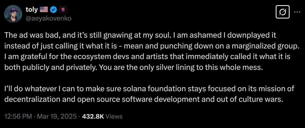 Anatoly Yakovenko, CEO da Solana Labs, se desculpou publicamente após a repercussão negativa do vídeo “America Is Back — Time to Accelerate”, que misturava nacionalismo e mensagens políticas sobre identidade de gênero. O conteúdo gerou forte reação na comunidade e foi deletado horas depois. Yakovenko afirmou estar envergonhado por não ter reconhecido imediatamente a gravidade do post e prometeu que a Solana se manterá afastada de disputas culturais, com foco no desenvolvimento de software de código aberto e na descentralização.