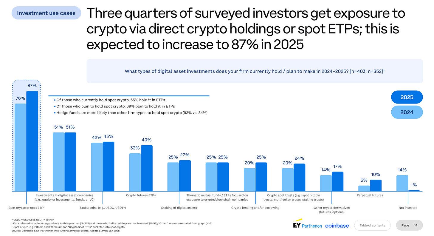 Estudo da EY-Parthenon e Coinbase revelou que a maioria dos investidores institucionais pretende aumentar sua exposição a criptoativos este ano. Apesar dos desafios regulatórios e de segurança, o setor está ganhando mais espaço nas carteiras, com destaque para DeFi, stablecoins e tokenização de ativos.