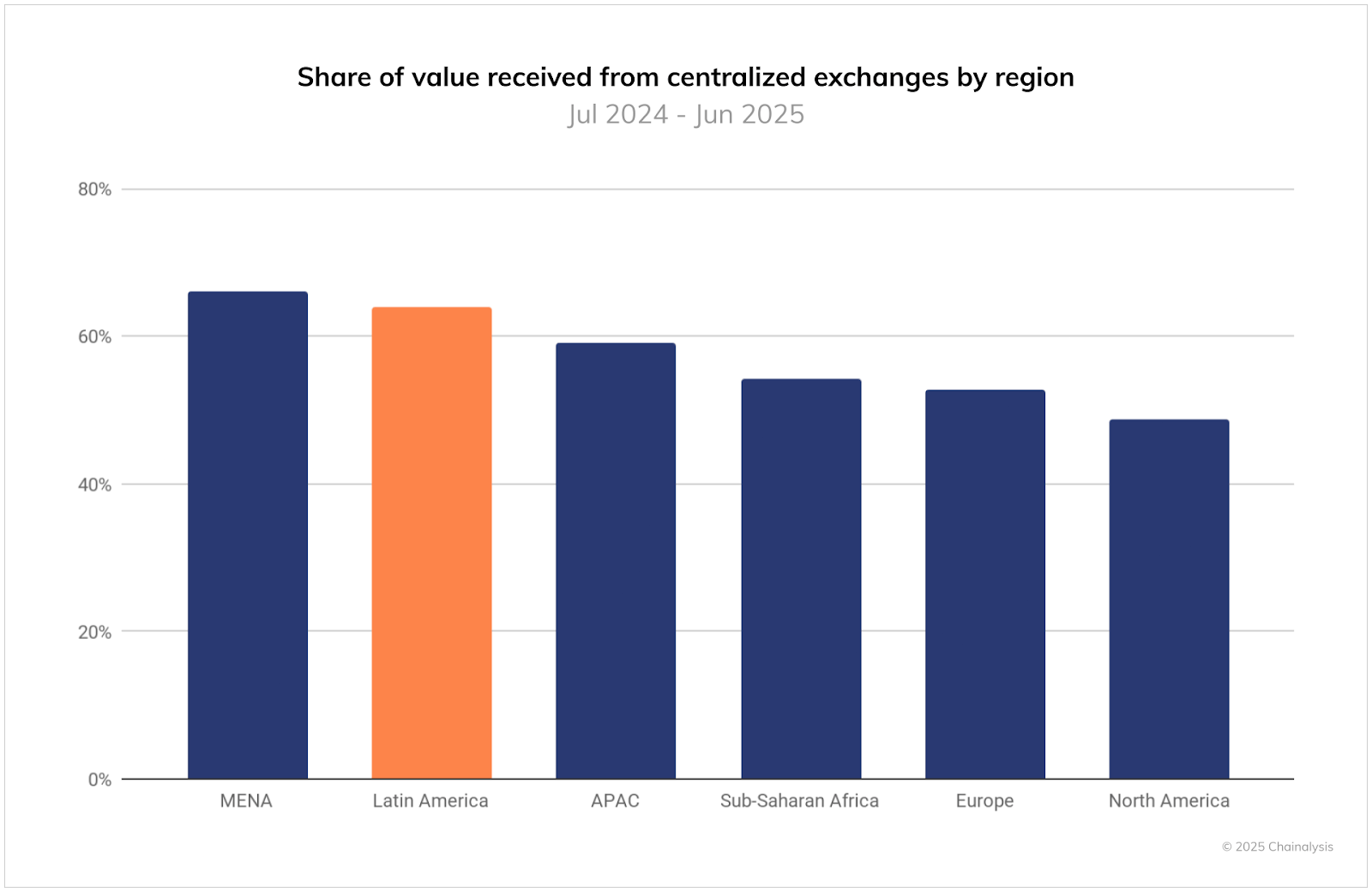 Mas não são só os ativos em si que importam. A forma como os usuários acessam cripto também é particular na região. 64% da atividade cripto latino-americana acontece em exchanges centralizadas (CEXs), contra 49% na América do Norte.