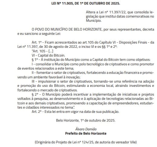 🏙️ BH, Capital do Bitcoin — Lei 11.905 sancionada: Belo Horizonte mira educação, eventos e inovação Web3 para firmar polo cripto no Brasil.