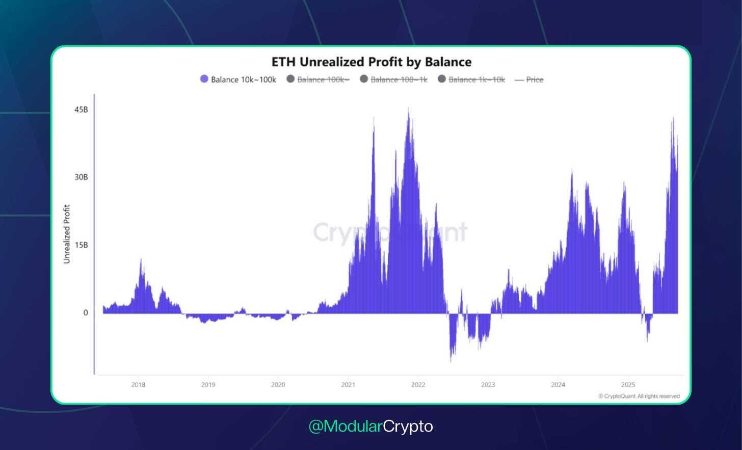 O gráfico mostra que investidores médios de Ethereum (com 10k a 100k ETH) estão novamente sentados em lucros não realizados que só haviam sido vistos no topo histórico de novembro de 2021. Esses “ganhos no papel” indicam que boa parte do capital está em posição confortável, o que pode aumentar a pressão de venda se o mercado perder força.