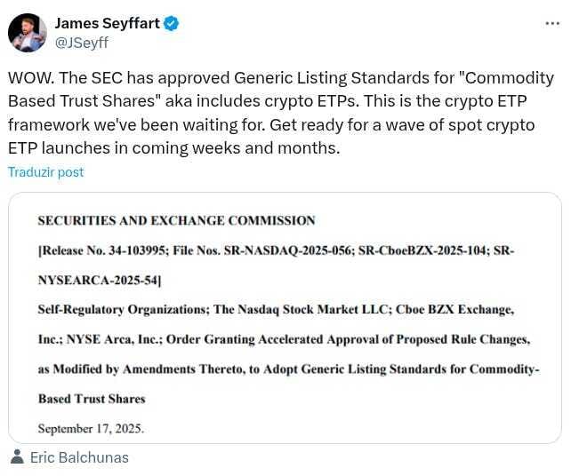 “UAU! A SEC aprovou Padrões Genéricos de Listagem para "Ações de Fundos de Investimento Baseados em Commodities", também conhecidas como ETPs de criptomoedas. Esta é a estrutura de ETPs de criptomoedas que estávamos esperando. Prepare-se para uma onda de lançamentos de ETPs de criptomoedas à vista nas próximas semanas e meses.”