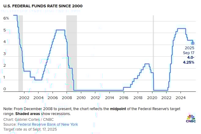 🏦 Corte confirmado — Fed reduz 0,25 pp para 4,00–4,25% e sinaliza mais dois cortes até o fim de 2025; rotação de fluxo pode favorecer ETH e SOL no curto prazo.