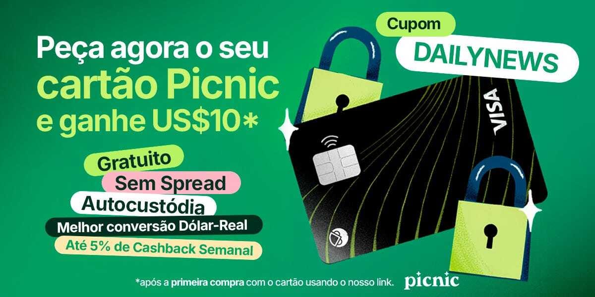 💚 Esta edição chega com apoio do cartão Picnic — Cartão Visa on-chain, sem taxas, com até 5% de cashback e $10 de USDC pra testar. É DeFi na maquininha. Bora pedir?
