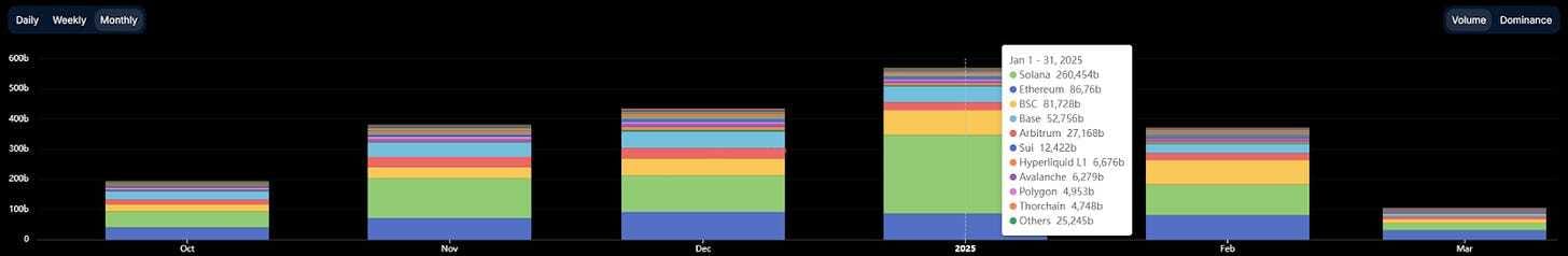 O volume negociado na Solana, porém, caiu 60% entre janeiro e fevereiro. Apesar de ter passado da marca dos US$ 100 bilhões pelo quarto mês consecutivo, a rede favorita dos degenerados fez US$ 102,4 bilhões em volume negociado.