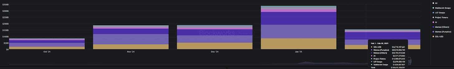 Mas isso nem é o mais preocupante. Em janeiro, as memecoins representaram 79% do volume negociado na Solana, e esse percentual pulou para 97% em fevereiro.