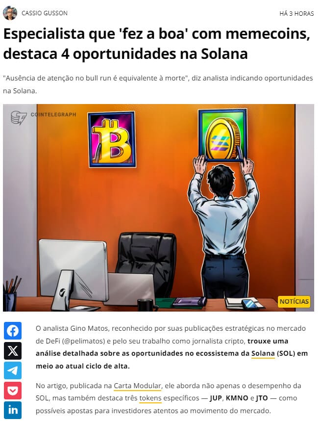 Essa semana, a Modular Crypto foi destaque no Cointelegraph Brasil! 🎉 Nossa Carta Modular do Research chamou a atenção pela qualidade das análises, sendo reconhecida por sua profundidade e insights sobre oportunidades em Solana, tokens de AI e gaming.