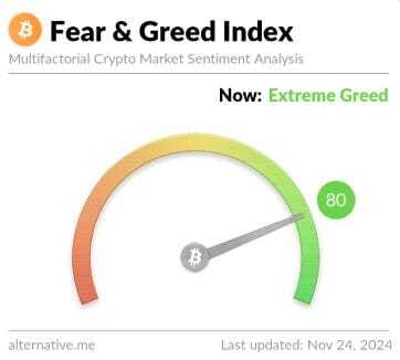 O Índice Medo & Ganância chegou a impressionantes 94 pontos (um pico de pura euforia!) antes de recuar para 80, mantendo-se na zona de Ganância Extrema. 🔥