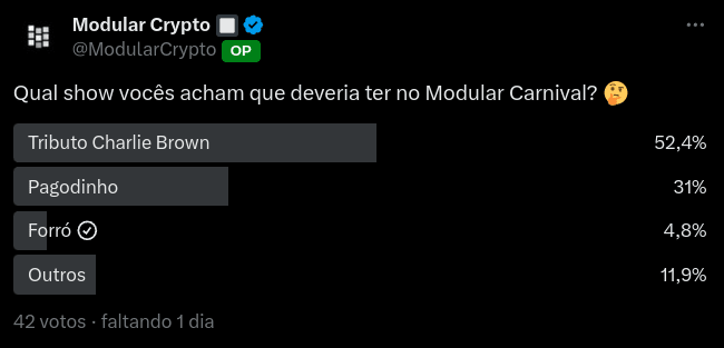 E por aqui? A Modular Crypto trouxe novas tasks do Carnival Quest (quer ganhar uma viagem para o Carnaval?), lançou a aguardada Carta Modular com análises afiadíssimas, e ainda foi destaque na mídia pelo nosso conteúdo de qualidade. 🔥