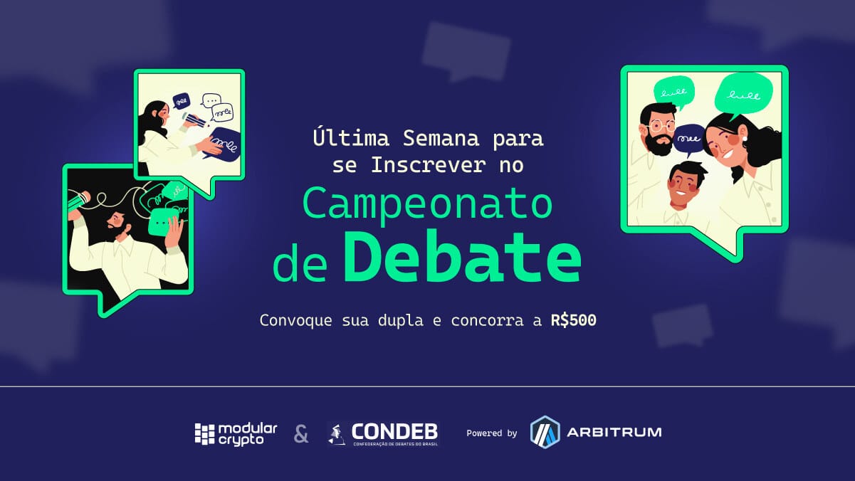 Últimas horas para garantir sua vaga no nosso Campeonato de Debate sobre Blockchain e Governança! Esta é a sua chance de mostrar suas habilidades, se aprofundar na Web3 e concorrer a um prêmio de R$500. O campeonato é patrocinado pela Arbitrum e conta com o apoio da CONDEB, além de oferecer certificação de ACG para todos os participantes.