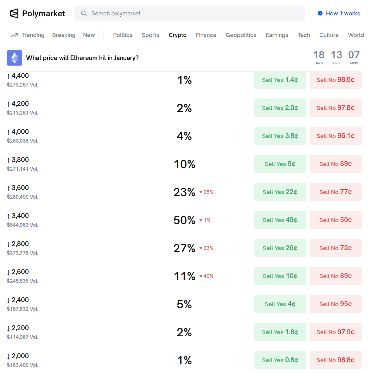 📊 O mercado aposta no meio do caminho para o Ethereum em janeiro, com probabilidades concentradas em US$ 3.400 no Polymarket, indicando consenso de continuidade e pouca euforia no curto prazo.